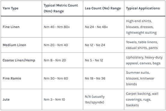 Table 2: Standard Yarn Count Ranges and Typical Applications